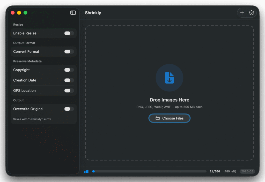 Shrinkly is a native macOS app for compressing images using the TinyPNG API. It supports PNG, JPEG, WebP, and AVIF formats with batch processing, live progress tracking, and optional resize and format conversion options — all in a clean, minimal interface.